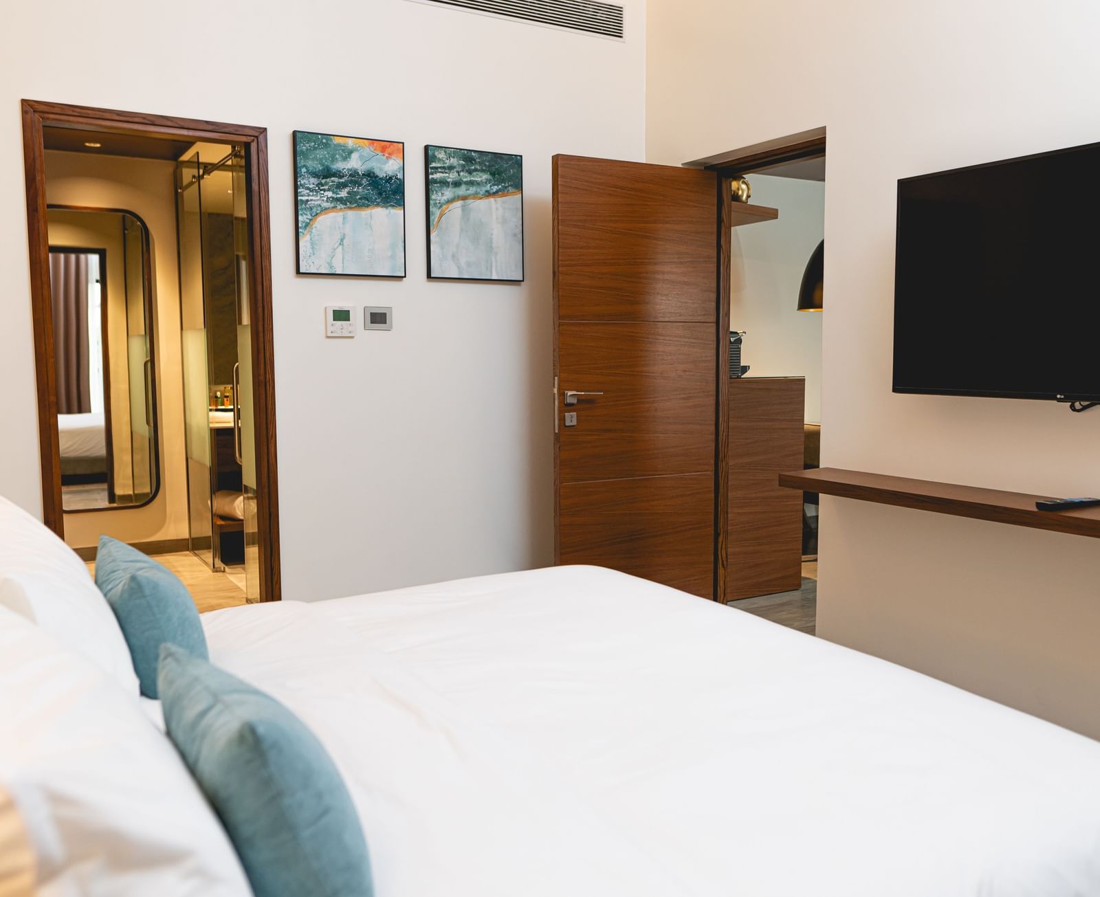 Unwind in style in our expansive 72 sq. m. Two Bedroom Suite, ideal for up to 4 guests. Alongside the modern amenities, enjoy the added convenience of an interconnected twin room, along with a separate living room, dining table, kitchen cabinet, guest toilet, master bedroom, and bathroom. Experience the ultimate in comfort and versatility in this exquisite suite.